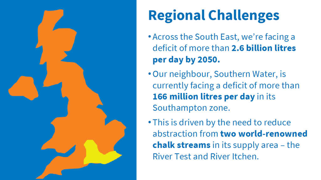 From what I could make out Portsmouth Water will own the reservoir but it will be paid for by Southern Water. It makes one wonder if it is all done just to confuse the public. However I don't think many of us realised quite how important this development is going to be for the future of South Hampshire as, if housing requirements and population increase continues in this area, then it is estimated that Portsmouth Water's customers (not including any Southern Water needs) will be using an additional 165,300,000 litres (36,360,917 gallons) by 2050 and without this additional resource and the extremely clever clever plans afoot for water recycling that will go with it, either abstraction rates would have to increase thereby killing all wildlife in the vitally important chalk streams in the area or residents going thirsty.