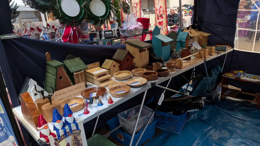 Much preparation, as normal for such an event, started the day before by loading cars in the daylight. We set up our stall that evening. Several Shedders were at the stall early on the day to lay out the sales items. These were predominantly wood crafts with a Christmas theme.