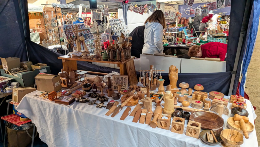 Much preparation, as normal for such an event, started the day before by loading cars in the daylight. We set up our stall that evening. Several Shedders were at the stall early on the day to lay out the sales items. These were predominantly wood crafts with a Christmas theme.