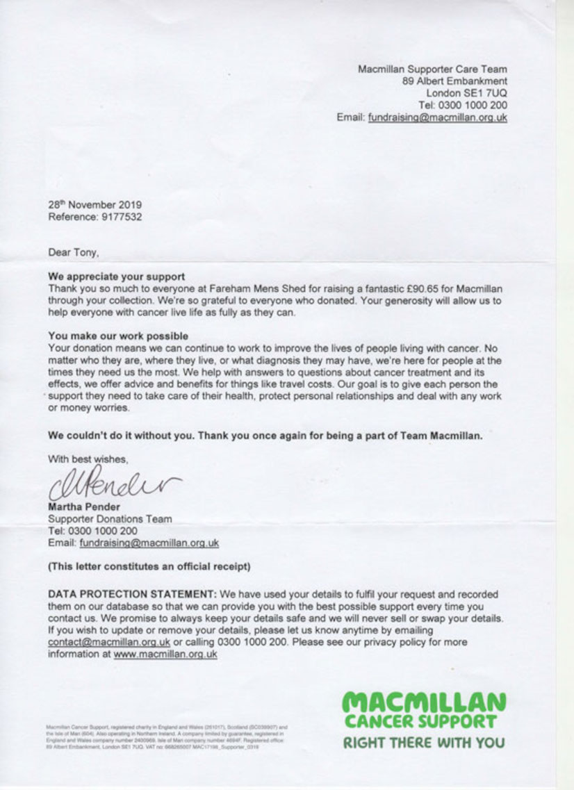 Although it was not a fund-raising event as such, Macmillan did provide a bucket and attendees kindly left us with £90.65 to forward to the charity. Many thanks for your generosity.