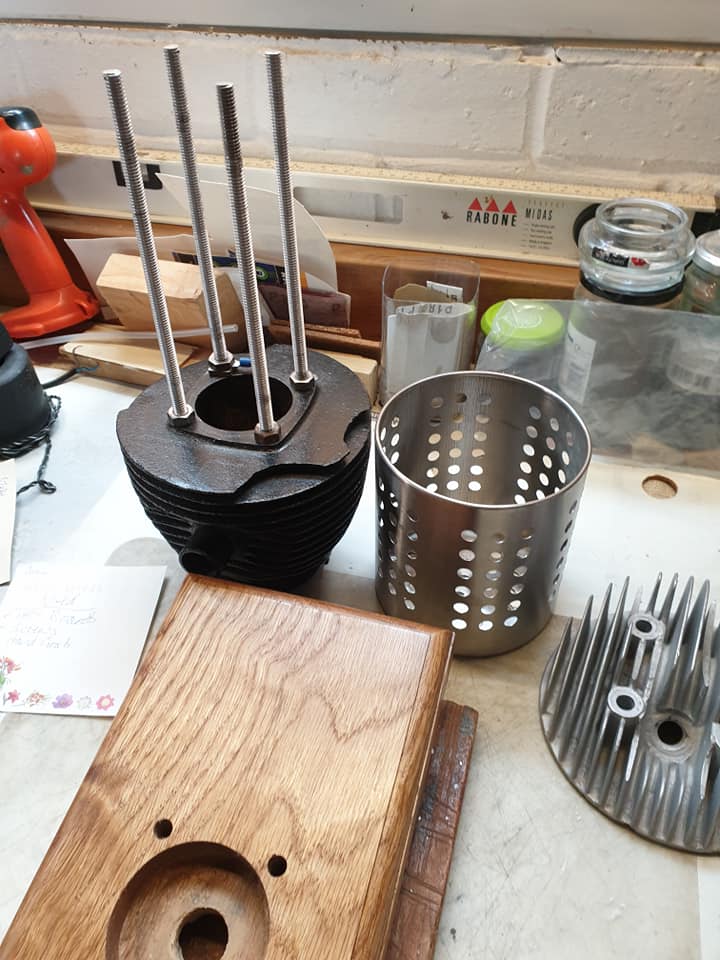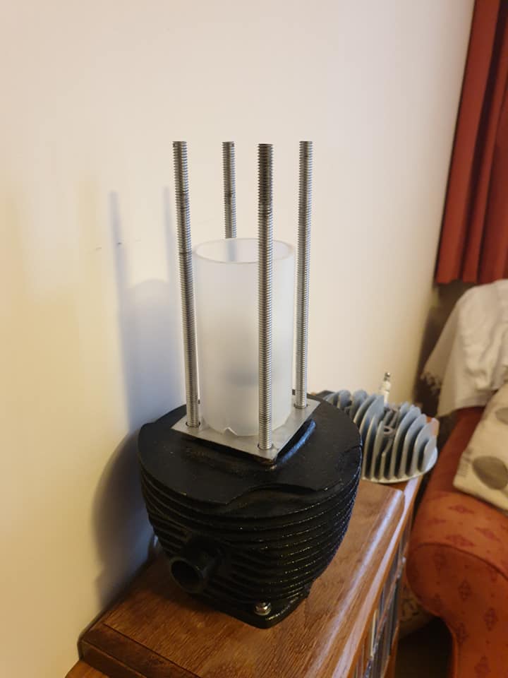 One of my Lockdown projects! I've made a wooden a base for a lamp that my son made for me. As you can see I've rounded of the edges of a nice piece of oak (I used the Shed's bench router between lockdowns!!). Then used a Forstner bit to make the hole for the cylinder head to sit in. It's a cylinder head from an old BSA Bantam (probably a 175cc two stroke). My son had not secured the head securely so I sourced a length of 5/16 thread bar. The threads were not metric of course! The body through which the lamp glows is a Lakeland or IKEA kitchen tool caddy (with bottom cut off). The plastic tube covering the bulb is an offcut flu liner for a new boiler we had to have before Christmas. I've used that to create more of a diffused the light.