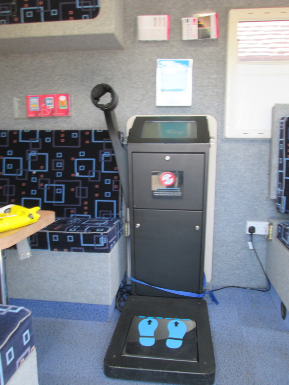 The appointments each took about 15 minutes, the booking system worked on a 20 minute interval to allow them to sterilise everything and then they invited you in, two at a time, one in the side and one in the back. Inside was the machine, they actually had to measure my height and weight (you might have thought that that could have been achieved automatically nowadays). Then I was invited to stand on the interrogator. Entered the figures previously obtained into the machine which then proceeded to ask 10 multiple choice questions about my life style.