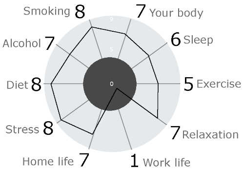 It then told me how much extra liquid (they say water, but what the hell) I needed to drink to bring you up to the recommended level and printed a little picture of the 10 different aspects of my life that it had asked about. Not mine I hasten to add but one that has been cobbled together, if it matches yours then good luck.