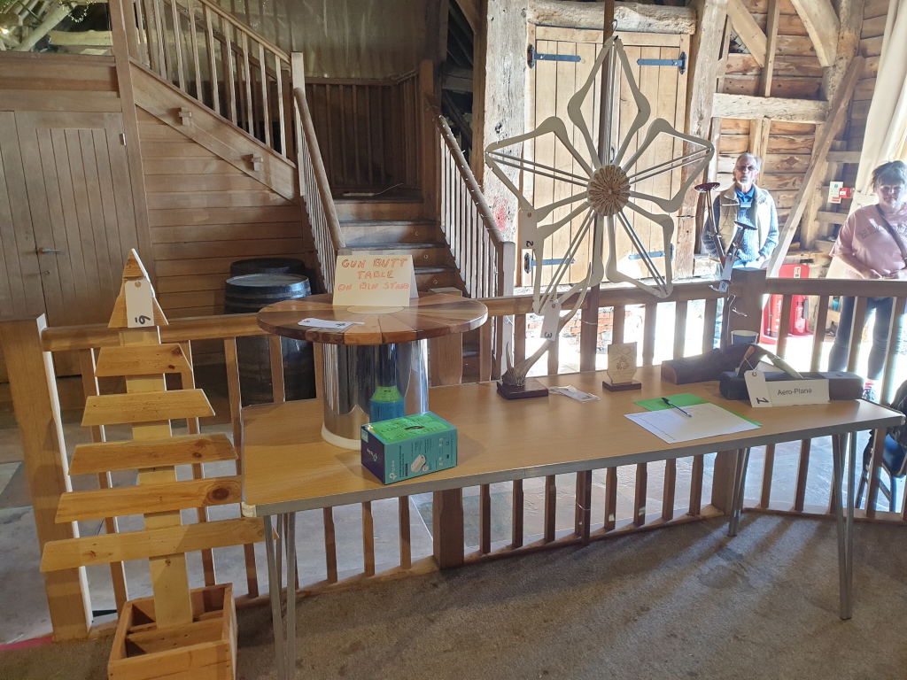 We introduced a new competition last year, the Colin Mansbridge Challenge, which raised just over £200 so we had to come up with something new for this year. We had the usual cake competition and we decided on an upcycling competition. Members were invited to make something new out of items that had been discarded or not wanted any more. On the day we had nine entries for the cakes and seven for the upcycling. Visitors were invited to vote for their favourite in each category and once again our members excelled themselves with great entries! 62 votes were counted, Brian McCarthy won the upcycling with a table made from decommissioned gun butts and an old kitchen bin. Chris Hodgson won the cake competition with his caramelised apple cake, however the entry that received the most comments was Thommo's cherry cake displayed in what can only be described as a hat box with very colourful red, white and blue ribbons around it.
