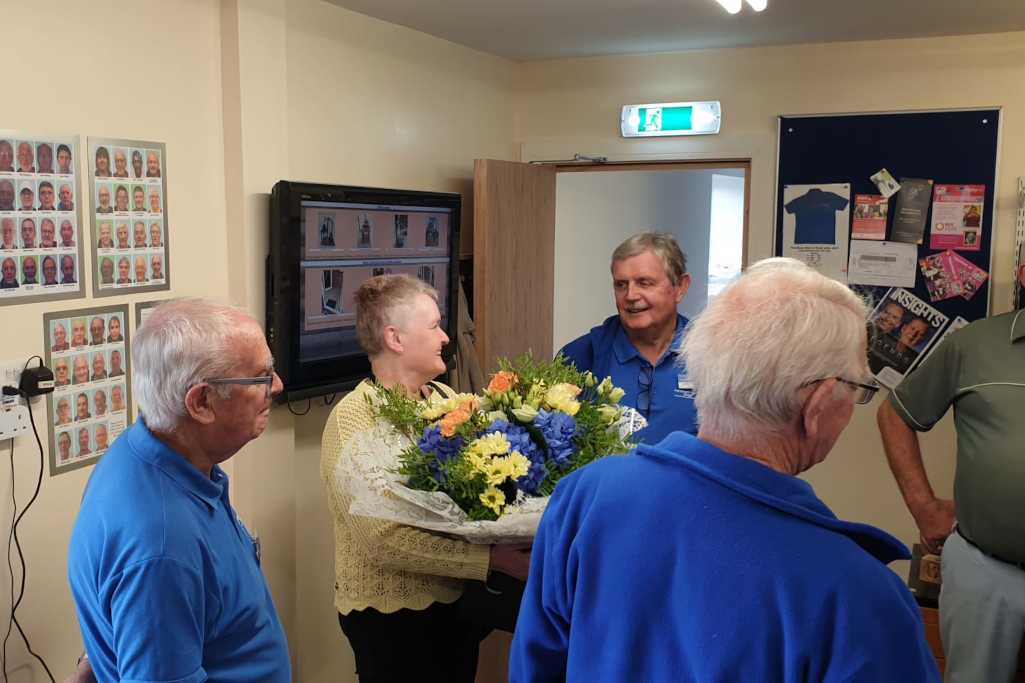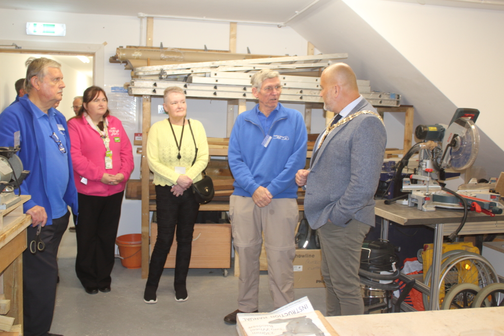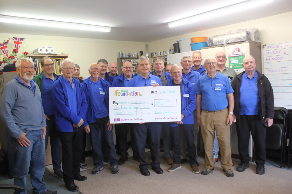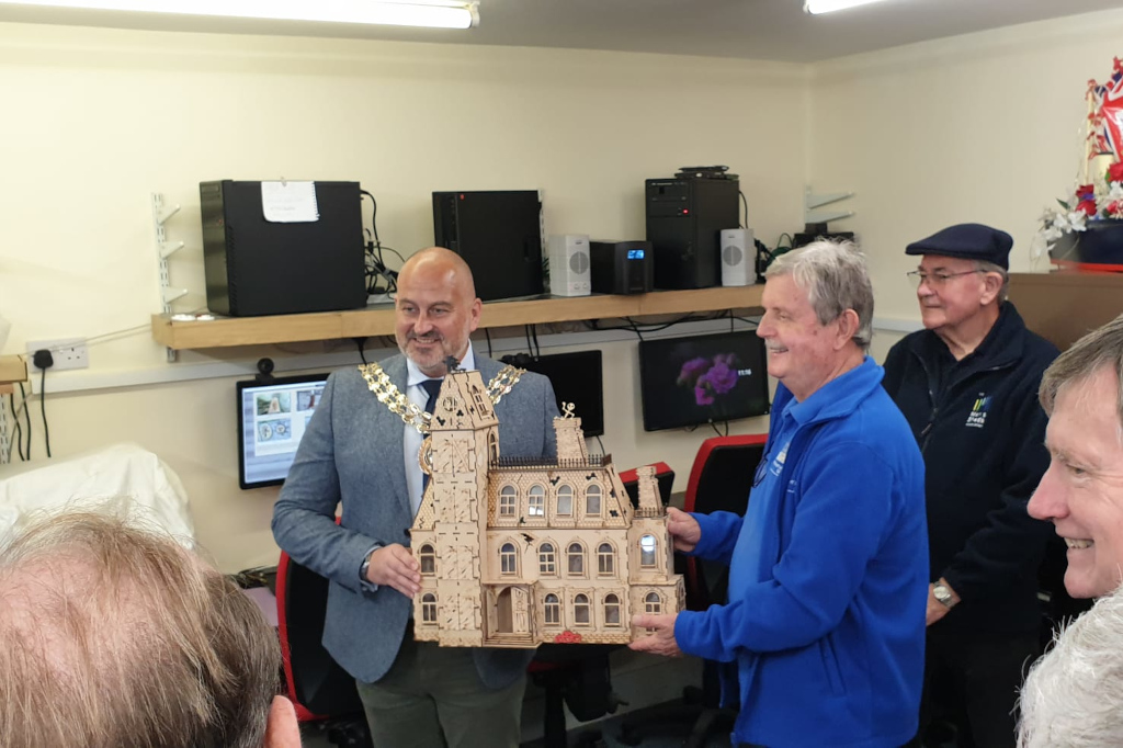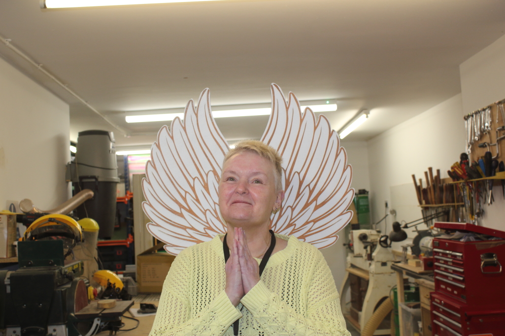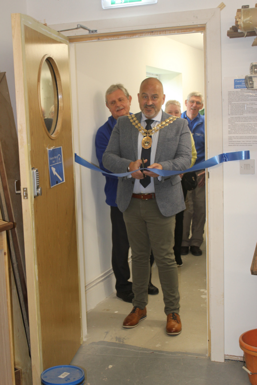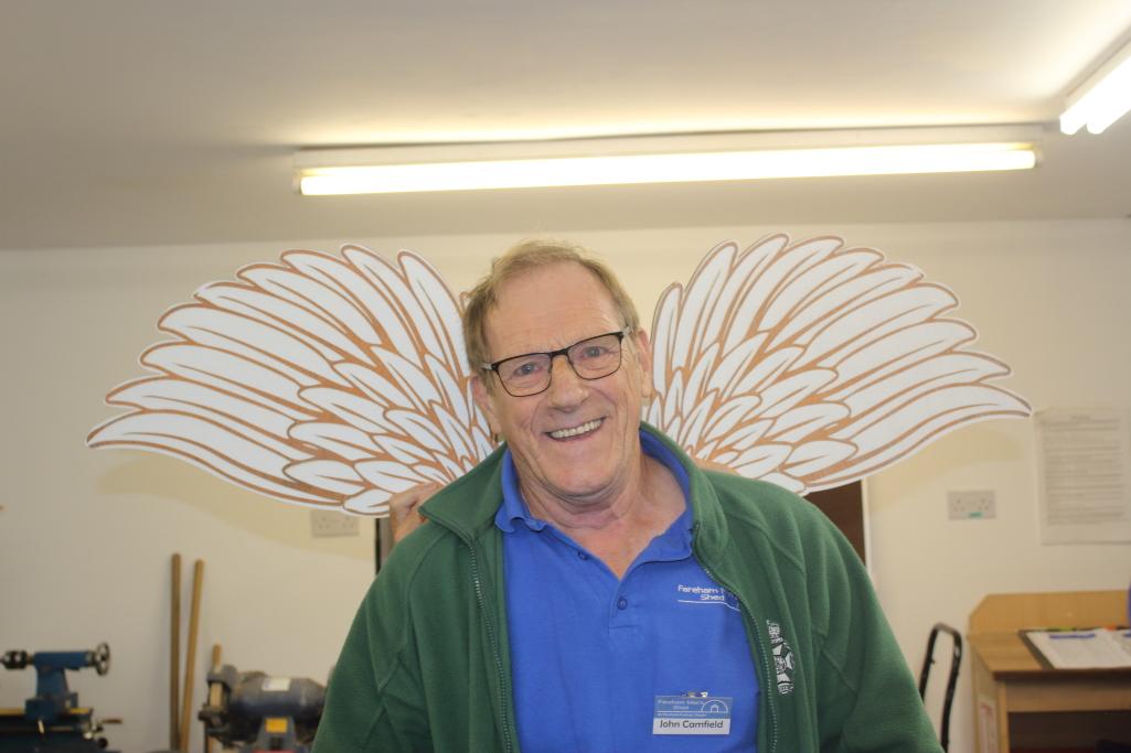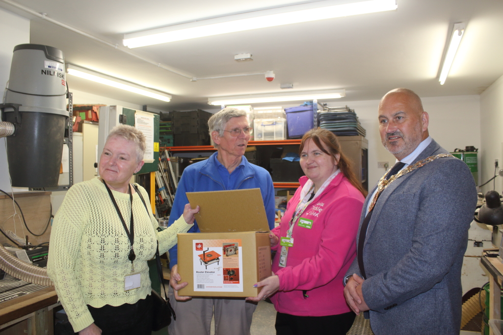 There is absolutely NO excuse for not attending now because with much fanfare, ado and hullabaloo, we invited Fred Birkett - our mayor; Councillor Sarah Pankhurst - one of our local councillors for both FBC and HCC; Graham Gowman - the local representative from head office and of course the indomitable Heidi bearing a fantastic cheque for £682.00 from Asda, that big shop in Newgate Lane Heidijp, you will always be welcomed with open arms. We had a really good turnout of members that have been heavily involved with the move although some did the honourable thing and left after a fairly short while because of the number there. Thank you very much for showing your faces and thank you even more for beating a quiet retreat, it really was appreciated by all. Much effort went on immediately before the ceremony, social room carpets cleaned, kitchen area polished, workshop tidied and dusted although we had to stop John P from polishing the tools as we thought that might be a bit OTT and people wouldn't believe that they were being used as much as they are. I am quite surprised that somebody didn't accuse us of press-ganging our wives for cleaning duties but it shows that we can do it when we need to. After a pleasnt half an hour or so of chat upstairs, panic set in because we needed to add the ribbon to the workshop door but couldn't find a way to do it as all of the staple guns seemed to be empty. Luckily Johns P and C dug around and found one (come on Gordon, we need those tool location charts) and just in time Chris H managed to come up with a pair of scissors, so we all trooped downstairs and Fred wielded the cutter so now The Shed is OFFICIALLY OPEN John C had bought a couple of the angels wings that he has laser cut for Titchfield Church and I just couldn't resist that picture and Sarah just looked so angelic. Bit of luck that John P is as short as he is 'cause he held the wings for the pictures. Then after Chris L had explained what was happening in the workshop, about Thommo's horses and showed Heidi the new router lift which their last gift paid for and what is for, it was back upstairs for a few refreshments. To finish the morning we made a couple of gifts of our own. The Halloween advent calendar was given to Cllr. Birkett as he believes that he knows of a worthy cause that would appreciate it and our Sarah from Moonstones Florist in Fareham Park Road did us proud as usual, by creating a fantastic floral bucket bouquet for Cllr. Pankhurst. So if you haven't shown your face since last year now is the time to indulge in a bit of camaraderie, get on with those little (or big) jobs that heve been waiting for the tools that are now available, a light social atmosphere for cards, cribbage, Scrabble and our latest card game, Skip Bo and of course a cup of tea and a custard cream. Author: Chris Nixon