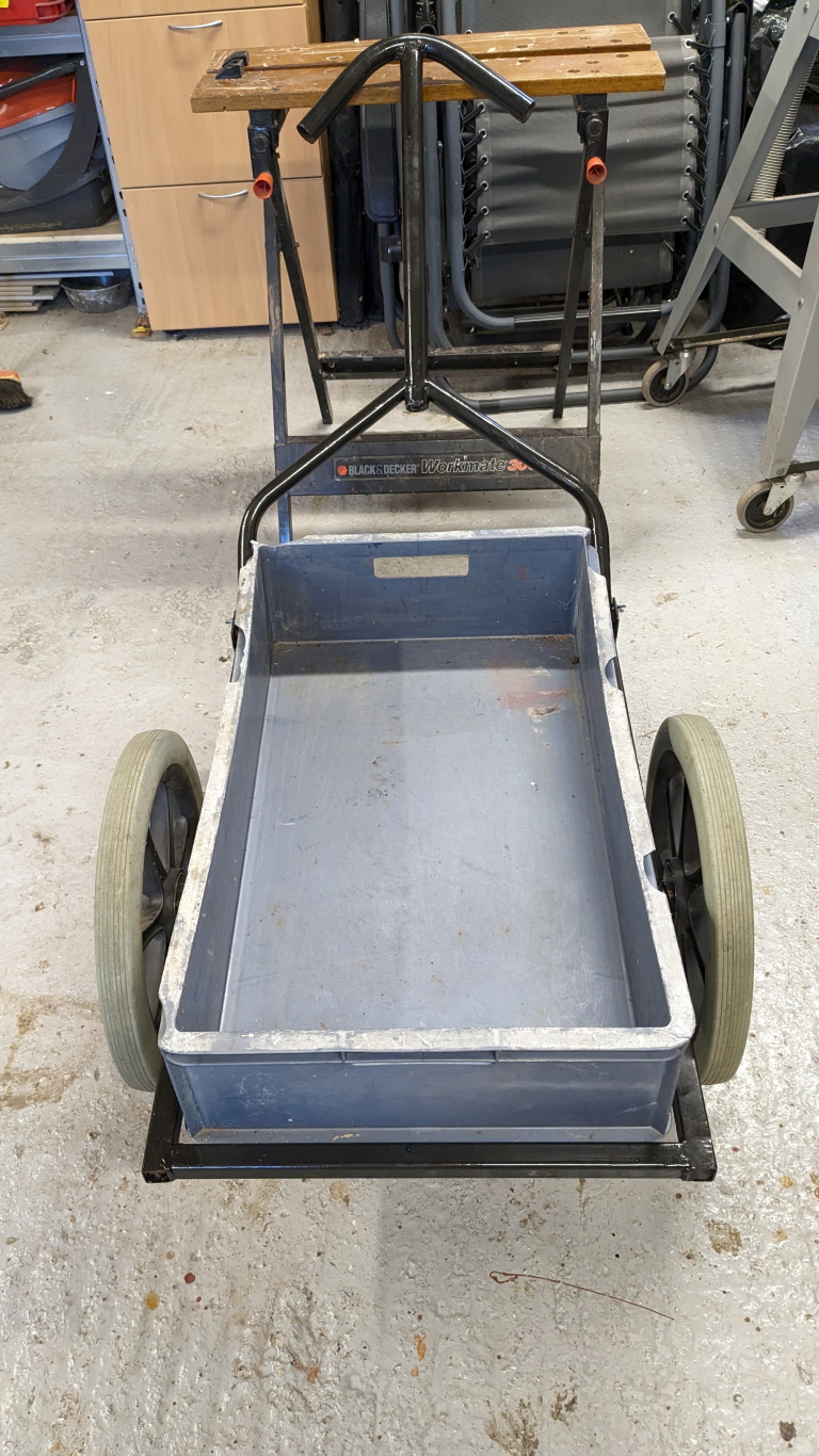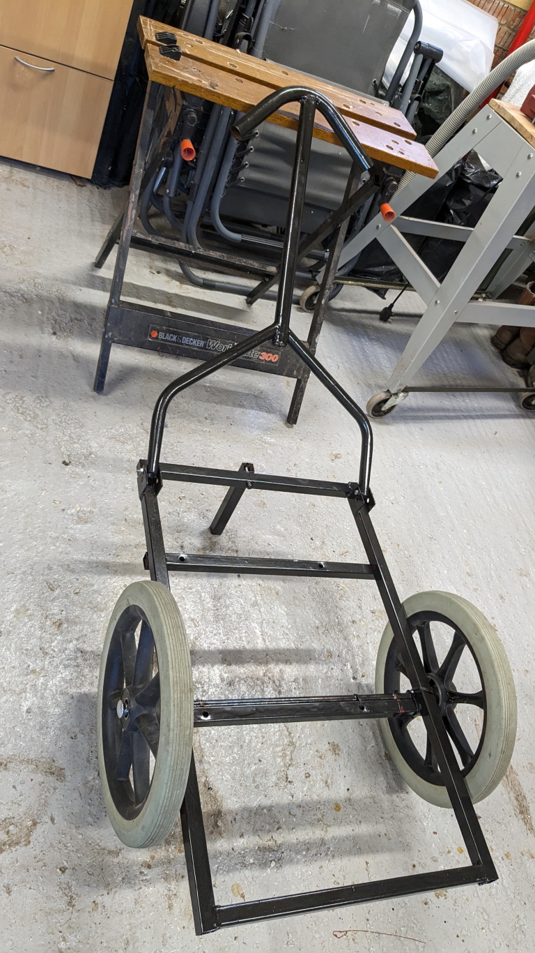 10 years ago a set of wheelchair wheels were given to a member to make an old-fashioned trolley for his grandchildren. Unfortunately this was in the days before FMS existed and he really needed help as he had two left hands when it came to such advanced projects, so they lay in his garage gathering dust for all of those years. As is every man's wont, he decided to clear the rubbish, wondered what to do with the wheels and thought that he would donate them to The Shed to see if they were of any use, and then forgot all about them, BUT, the other day he rolled up and was presented with this. BrianM had taken the small wheels, found some bits of a discarded theatre hanging rail in the skip, and with his flair for this type of thing, made this. What a great idea, useful and just the right size. TFT snaffled the big wheels so all-in-all what was clogging up his garage became a really useful donation. Author: Chris Nixon