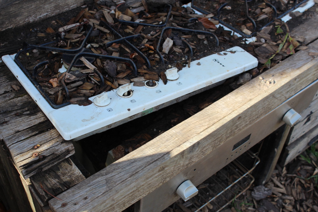 With recycled pallet material, roofing felt and a bucket full of screws plus the use of a pressure washer for the hobs, baked on mud is much better than no nails any day! All was eased back in to some shape and are now much safer for the children to cook up plenty of pies. I would think that this must be a temporary fix as some of the items are now well out of guarantee but they do seem to have been well used and must have given much fun. The only thing missing now is a dishwaher, maybe next time.