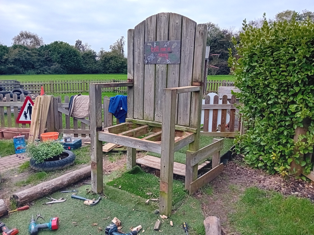 We have have been busy again, Brian M. and I made a visit to Redbarn School earlier this week to look at this giant chair which had been condemned for use as unsafe for the children to play on. After looking at it we both decided that it was repairable and we arranged with the school that it could be repaired in the half term, so Brian and I set about working on it on Thursday the 31st October, it took longer to remove the rotten timber with their rusting screws than it did to fix the new slats.