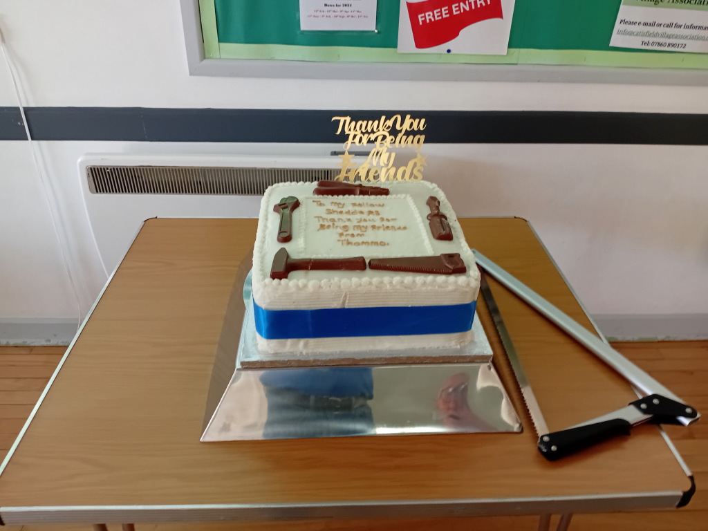 A phone call at he Shed the other morning from Thommo's daughter "Will there be anybody there this afternoon as we have something that Thommo insisted that we give you?" Well what could I say, the social afternoon was on so I said "Yes, come along, we'll find somewhere to put whatever it is, expecting it to be some sort of tool." Come 14:00 and Thommo's wife and Julie appeared carrying this big box. It was obviously heavy and fragile, so there were RichardB, AdrianW, PaulB, DerekA, DavidD and me wondering what on earth it was. The box was carefully placed on the table and something we did not expect was inside. This fantabulous cake, bearing in mind Thommo's game during Covid, putting skeletons around his domain, it seemed so appropriate to realise just what Thommo had done.