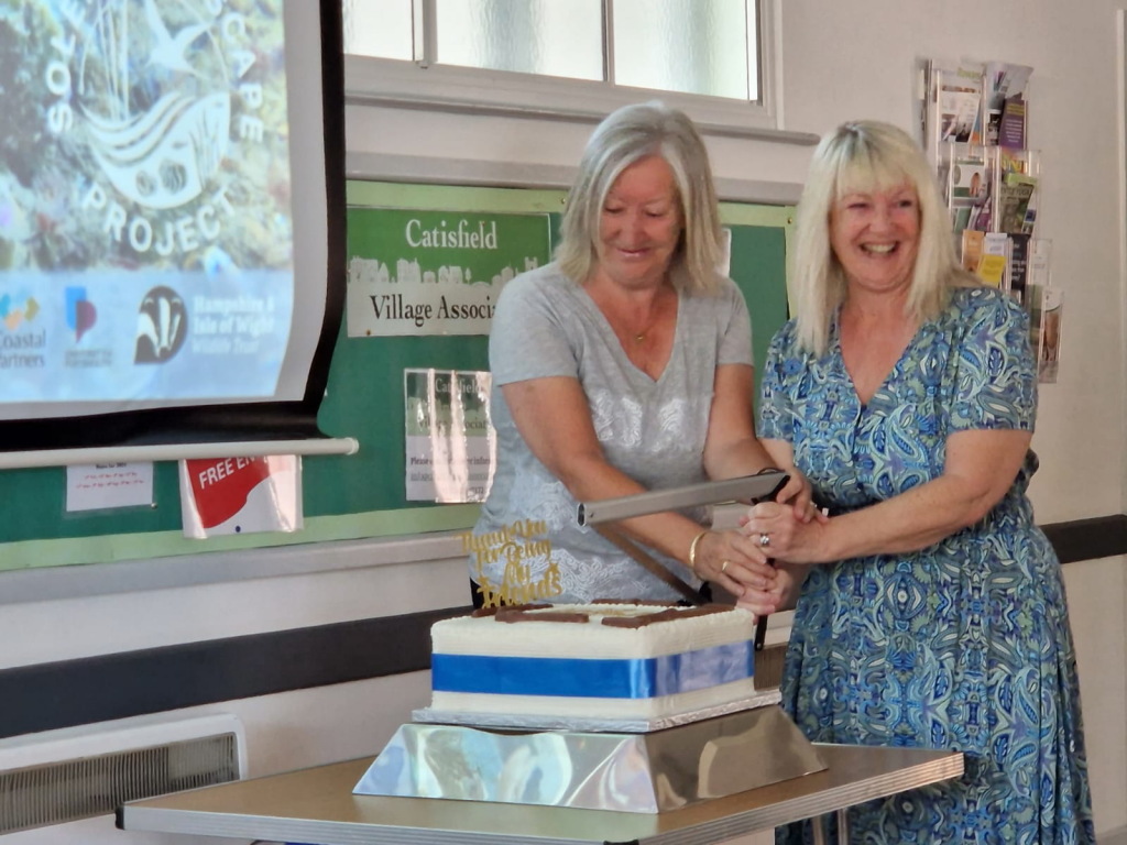 It is (was) a rich fruit cake, laced fairly heavily with strong liquor, how they managed to carry it in to The Shed heaven only knows because it took two of us to take it into the hall. We actually wondered whether they were carrying on Thommo's sense of humpour by burying a lead weight in it. We asked Mo, Helen and Julie. to come and cut it and they showed up to watch the H&IoW Trust presentataion (see next item). Luckily JohnP found a very nice cake stand to show it off to it's best and ChrisH brought a tri-bladed saw just in case.
